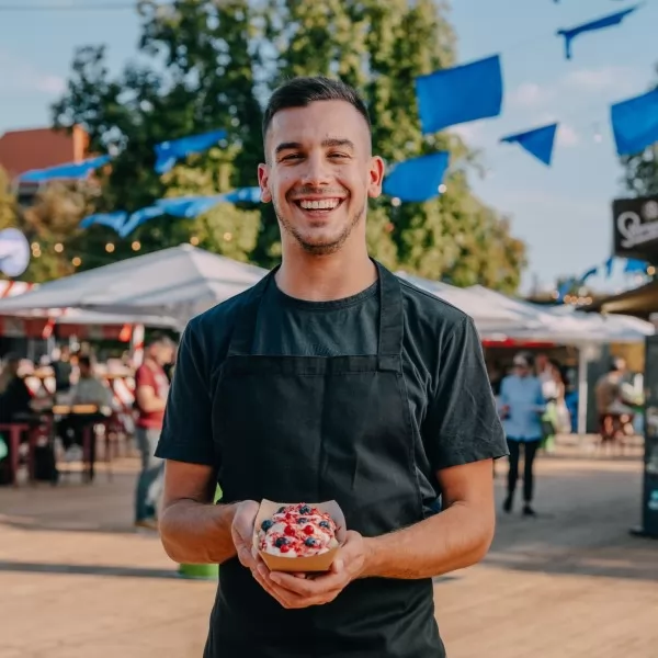 Na kućici Gdje je Jura by Juraj Klepić smo se osvježili izvrsnom voćnom salatom, a kušali smo i njegov Green Cheesecake, doznavši od mladog pastry chefa kako će na već u idućim danima predstaviti i svoju najnoviju kolekciju kolača.